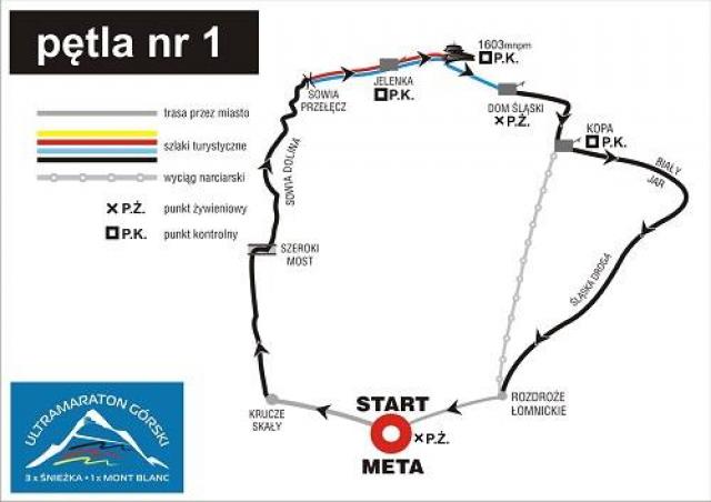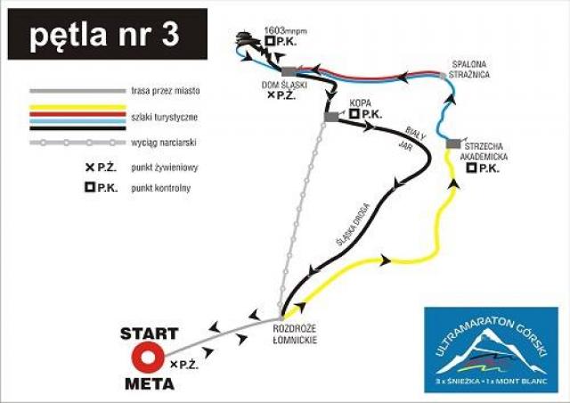 ULTRA (57 km): dystans mini + średni + centrum Karpacza – szlak żółty (dawny tor saneczkowy) – Strzecha Akademicka – Dom Śląski – Śnieżka – Dom Śląski – Kopa – Śląska Droga – Centrum Karpacza.